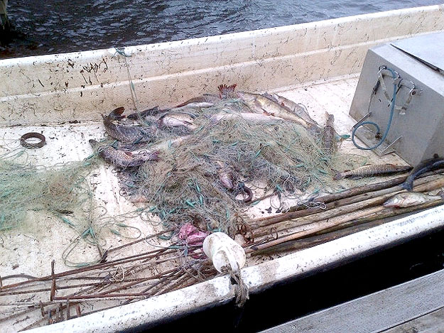 In de boot lag een flinke berg staande netten waarin een grote partij snoek en snoekbaarzen vast zat. De vissen waren zodanig slecht behandeld dat een aantal van hen – negentien snoekbaarzen met een totaal gewicht van 52 kg, zes brasems en één roofblei – het niet heeft overleefd. Gelukkig kon de overgebleven vis, waaronder elf snoeken variërend van 60 tot 120 cm in lengte, worden gered en levend in het water worden teruggezet. De dode snoekbaarzen en roofblei zijn geschonken aan een verzorgingstehuis in Naarden.
