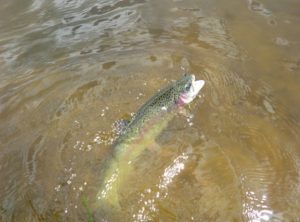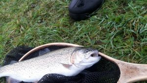 Na deze sessie zijn we nog anderhalf uur gaan vissen en er werden op streamers nog een aantal exemplaren gevangen. Hans Bogerman ving twee forellen op de zojuist gebouwde kleine steamers.