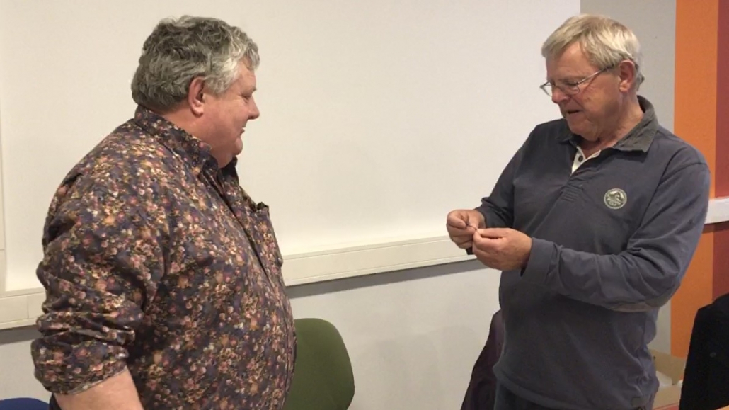 Voor zijn verdiensten voor de vereniging is John benoemd tot erelid van de vereniging. Op bovenstaande foto werd hem de bijbehorende versierselen door de voorzitter opgespeld.